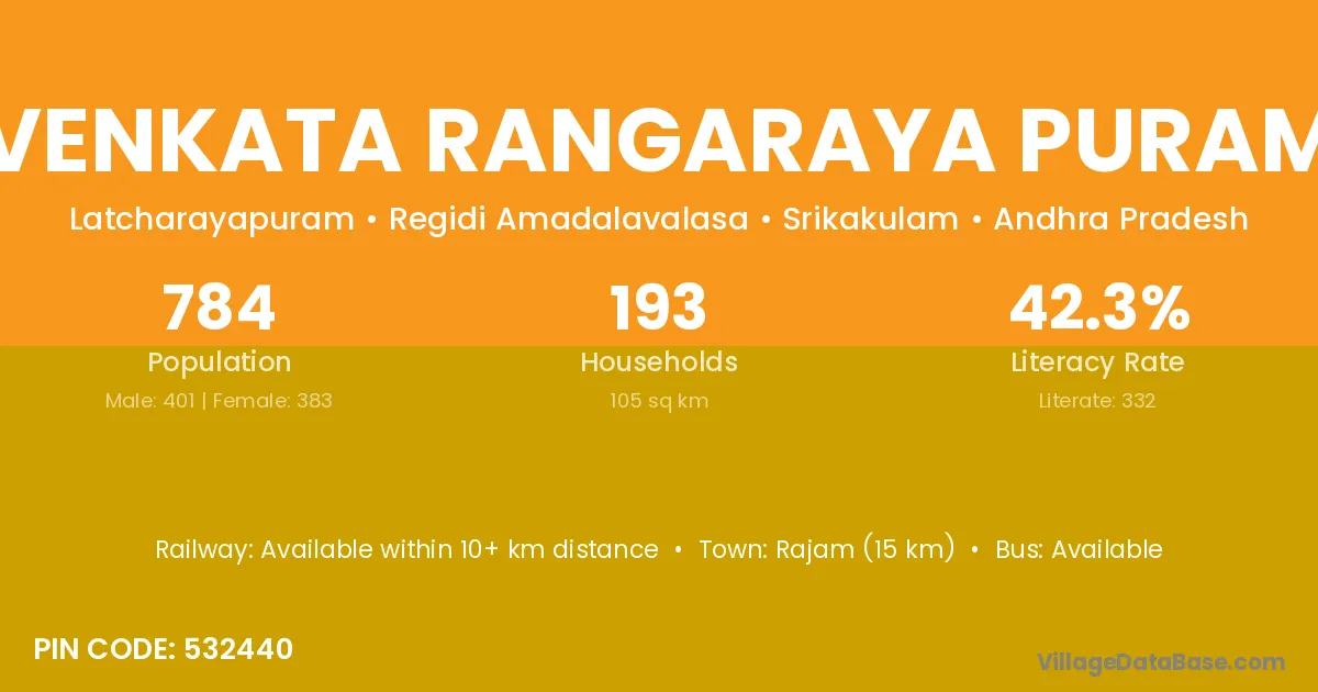 Rajam (15 km) is the nearest town to Venkata Rangaraya Puram village for major economic activities and is located approximately 15 km away.