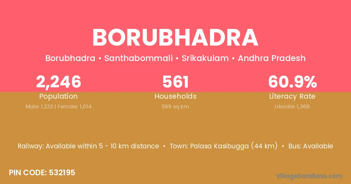 Palasa Kasibugga (44 km) is the nearest town to Borubhadra village for major economic activities and is located approximately 44 km away.