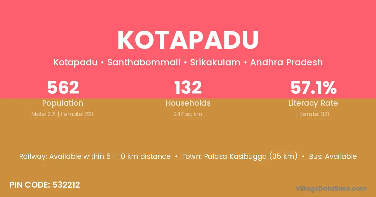 Palasa Kasibugga (35 km) is the nearest town to Kotapadu village for major economic activities and is located approximately 35 km away.