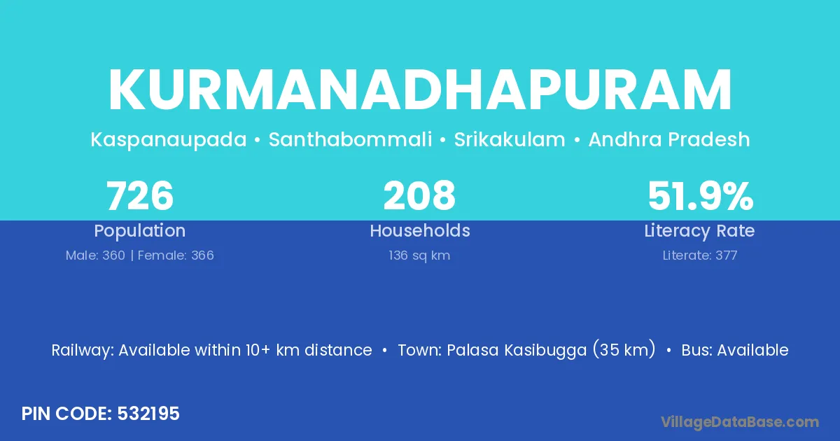 Palasa Kasibugga (35 km) is the nearest town to Kurmanadhapuram village for major economic activities and is located approximately 35 km away.