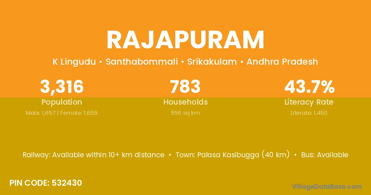 Palasa Kasibugga (40 km) is the nearest town to Rajapuram village for major economic activities and is located approximately 40 km away.