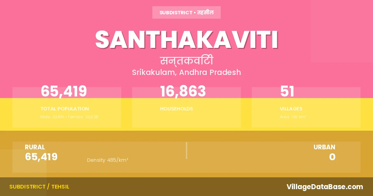 According to the 2011 census The total area of Santhakaviti Mandal is 135 km², with a population of 65419 people. The population density is 485 inhabitants per square kilometre, and there are approximately 16863 houses in the sub district.