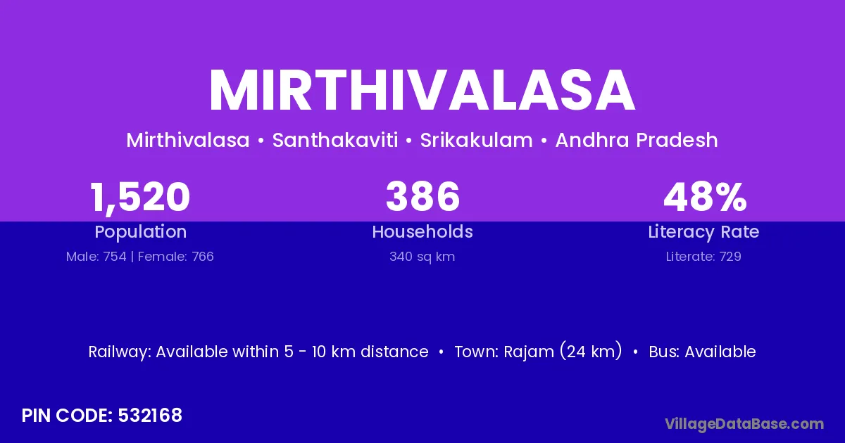 Rajam (24 km) is the nearest town to Mirthivalasa village for major economic activities and is located approximately 24 km away.