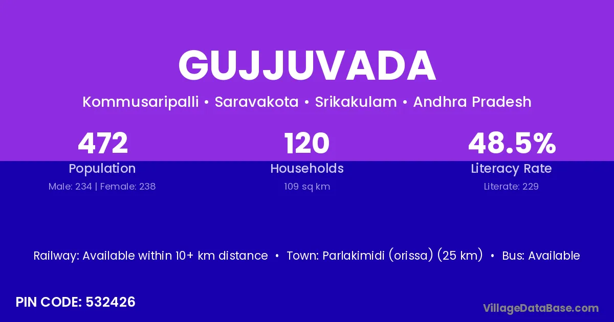 Gujjuvada village has a total population of 472 people, of which 234 are males and 238 are females.