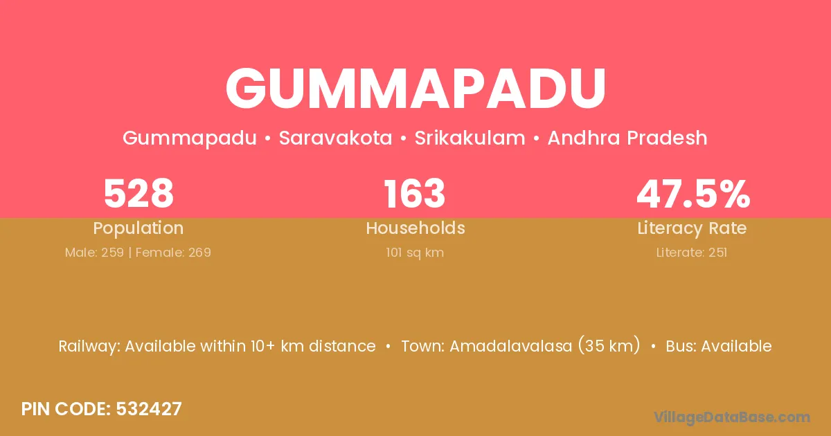 Amadalavalasa (35 km) is the nearest town to Gummapadu village for major economic activities and is located approximately 35 km away.