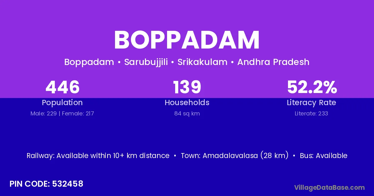 Amadalavalasa (28 km) is the nearest town to Boppadam village for major economic activities and is located approximately 28 km away.