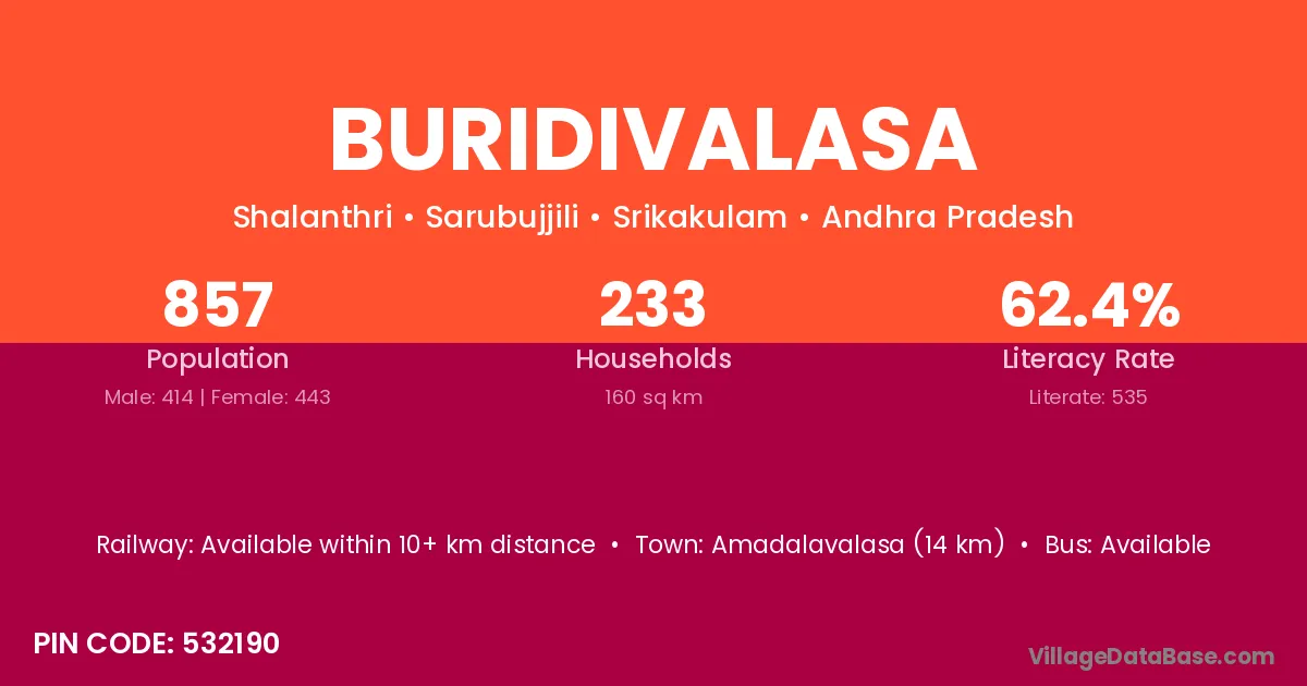 Amadalavalasa (14 km) is the nearest town to Buridivalasa village for major economic activities and is located approximately 14 km away.