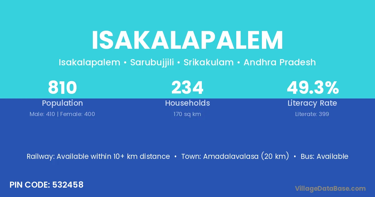 Amadalavalasa (20 km) is the nearest town to Isakalapalem village for major economic activities and is located approximately 20 km away.