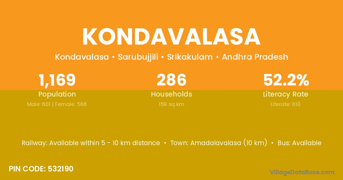 Kondavalasa village has a total population of 1,169 people, of which 601 are males and 568 are females.