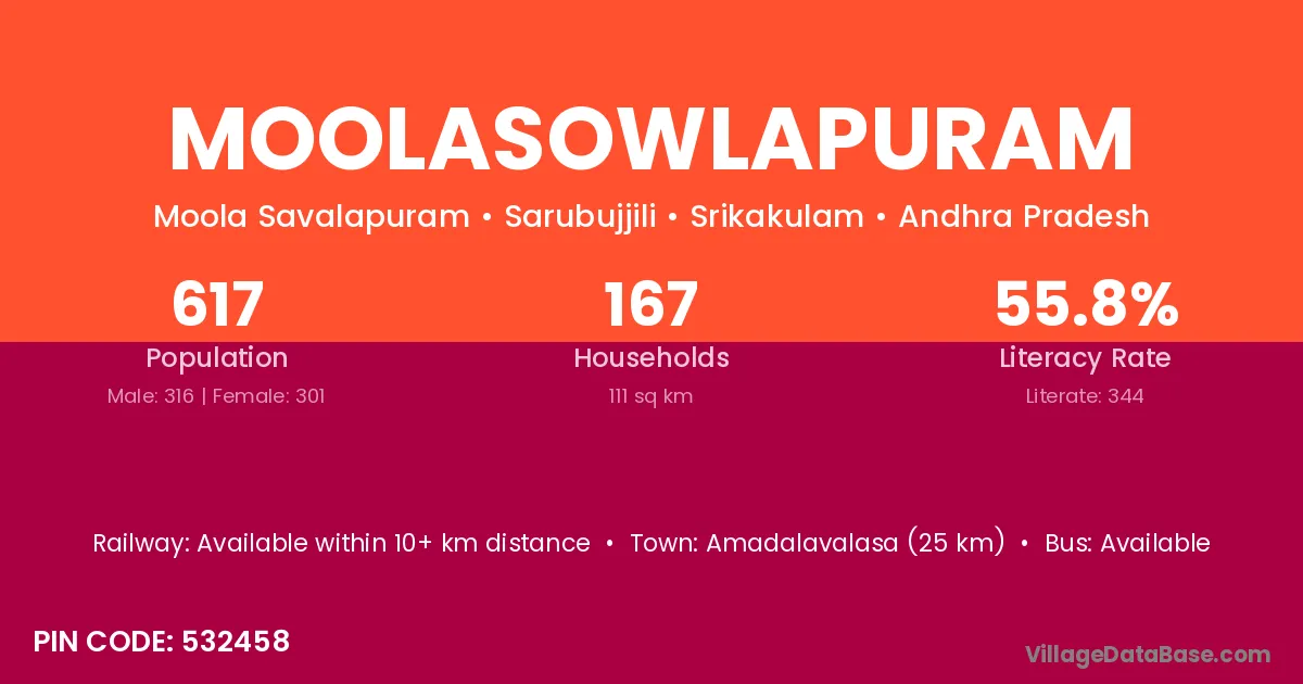 Amadalavalasa (25 km) is the nearest town to Moolasowlapuram village for major economic activities and is located approximately 25 km away.