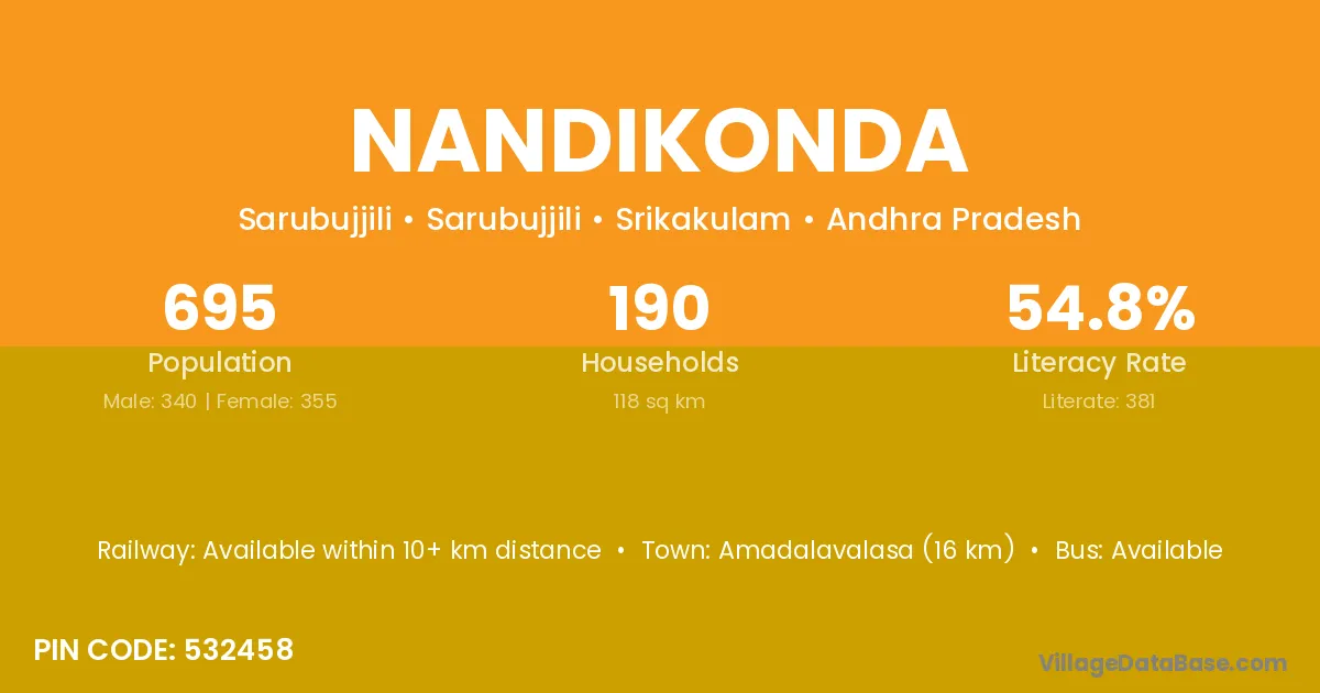 Amadalavalasa (16 km) is the nearest town to Nandikonda village for major economic activities and is located approximately 16 km away.