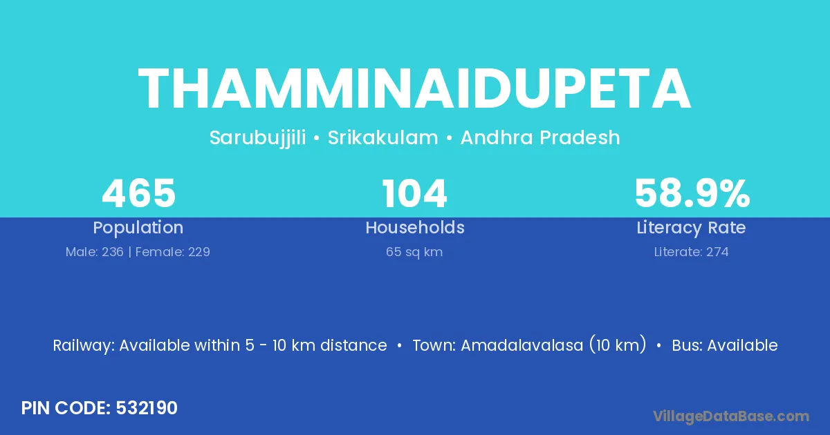 Amadalavalasa (10 km) is the nearest town to Thamminaidupeta village for major economic activities and is located approximately 10 km away.