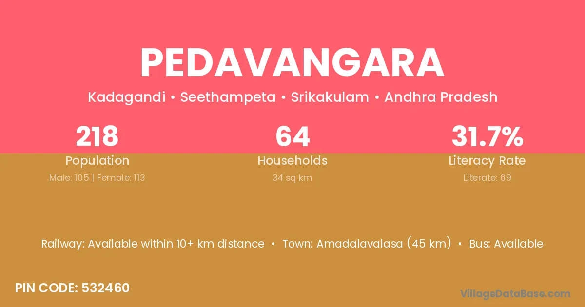 Amadalavalasa (45 km) is the nearest town to Pedavangara village for major economic activities and is located approximately 45 km away.
