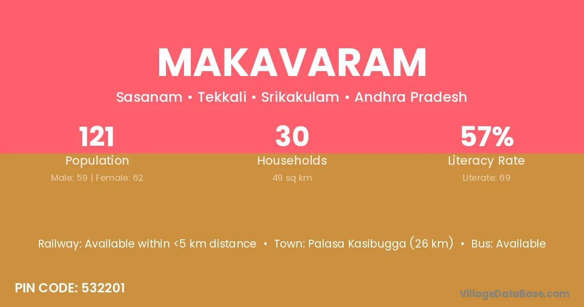 Makavaram village has a total population of 121 people, of which 59 are males and 62 are females.