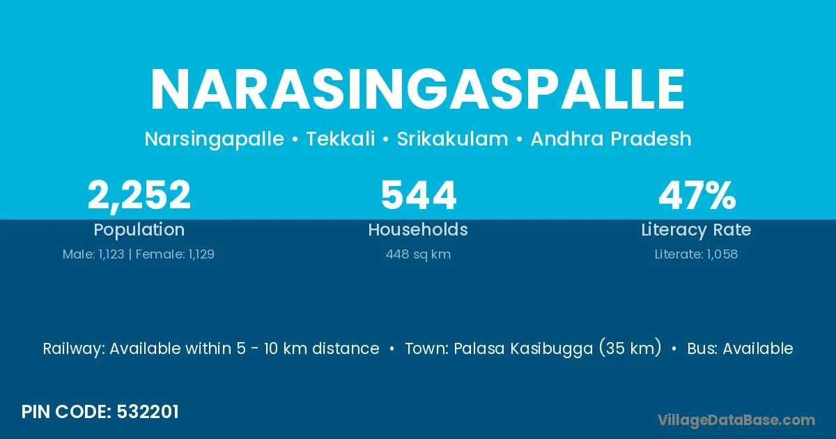 Palasa Kasibugga (35 km) is the nearest town to Narasingaspalle village for major economic activities and is located approximately 35 km away.
