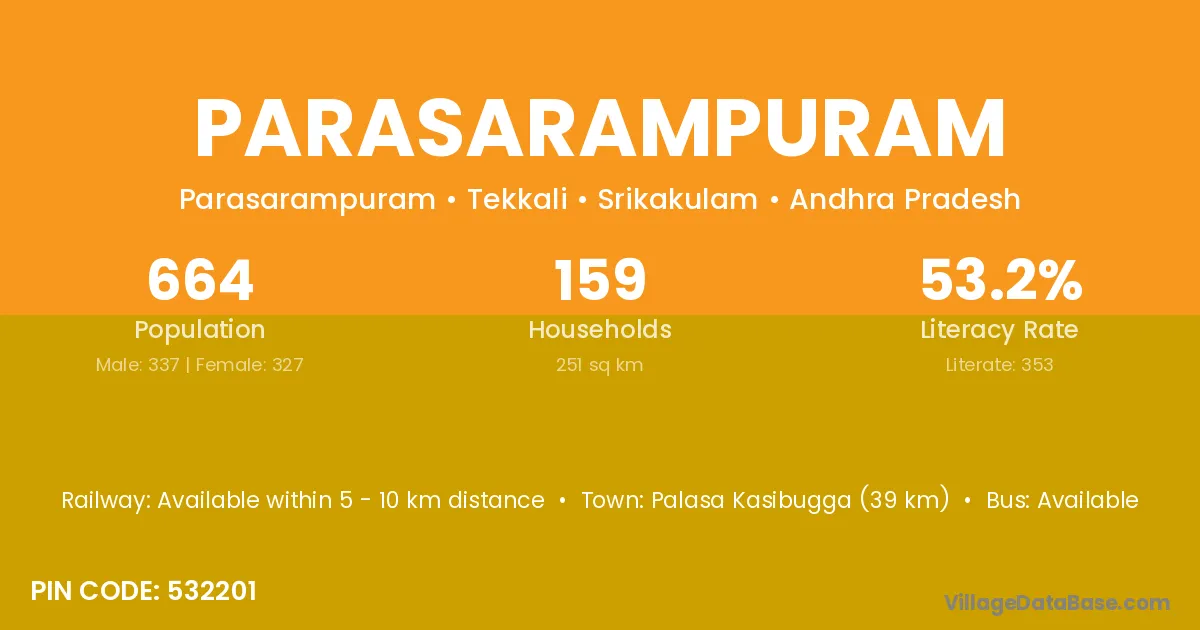 Palasa Kasibugga (39 km) is the nearest town to Parasarampuram village for major economic activities and is located approximately 39 km away.