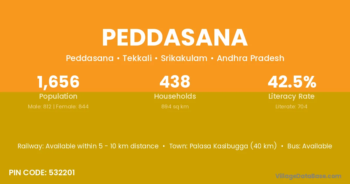 Palasa Kasibugga (40 km) is the nearest town to Peddasana village for major economic activities and is located approximately 40 km away.