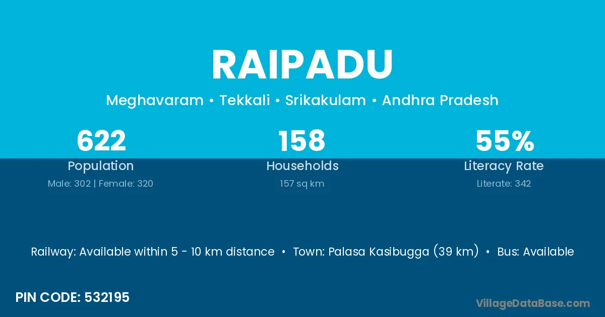 Palasa Kasibugga (39 km) is the nearest town to Raipadu village for major economic activities and is located approximately 39 km away.