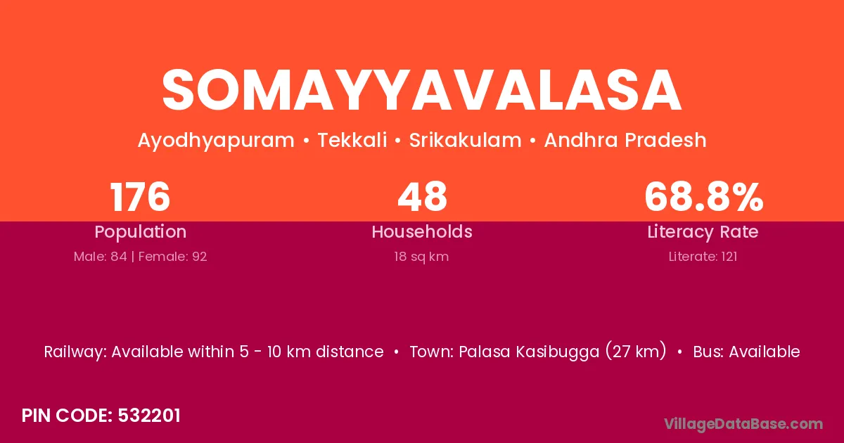 Somayyavalasa village has a total population of 176 people, of which 84 are males and 92 are females.