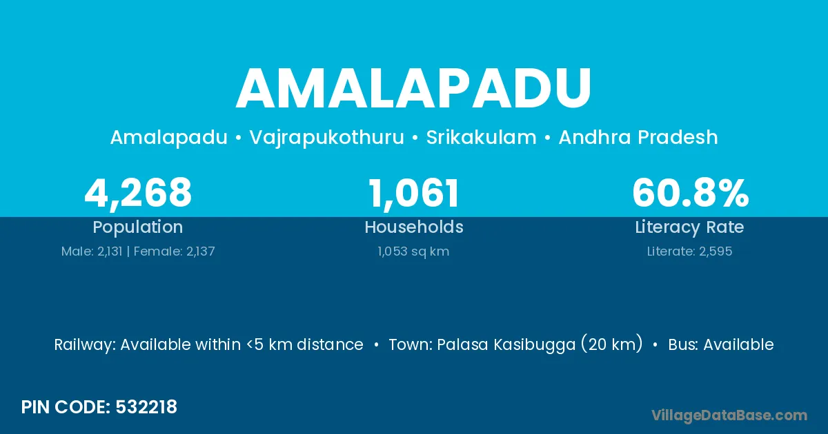 Palasa Kasibugga (20 km) is the nearest town to Amalapadu village for major economic activities and is located approximately 20 km away.