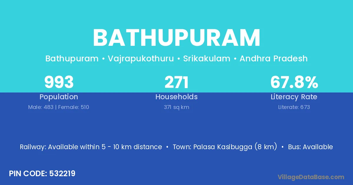 Bathupuram village has a total population of 993 people, of which 483 are males and 510 are females.