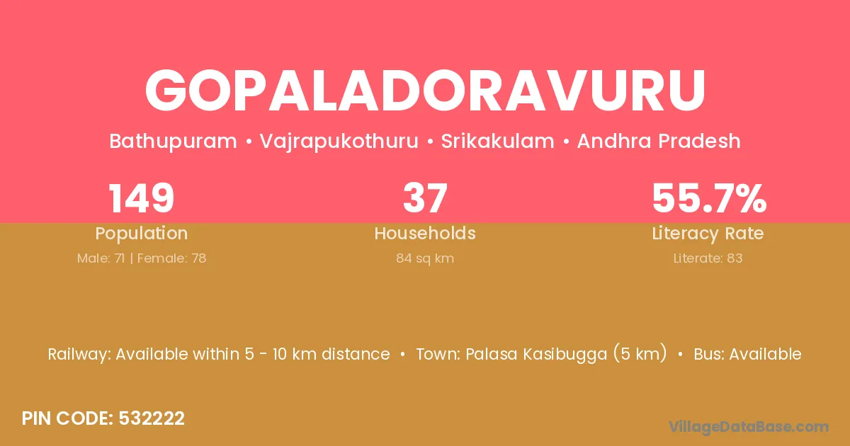 Palasa Kasibugga (5 km) is the nearest town to Gopaladoravuru village for major economic activities and is located approximately 5 km away.