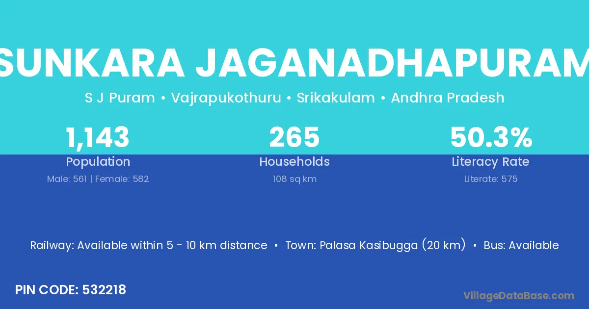 Sunkara Jaganadhapuram village has a total population of 1,143 people, of which 561 are males and 582 are females.