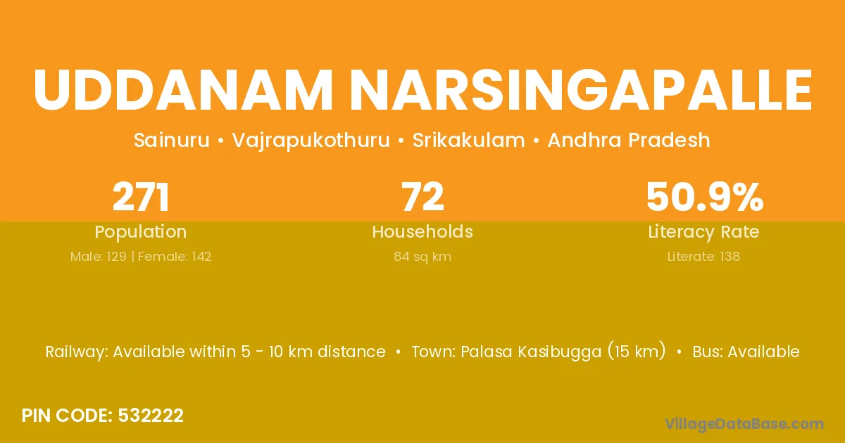 Palasa Kasibugga (15 km) is the nearest town to Uddanam Narsingapalle village for major economic activities and is located approximately 15 km away.