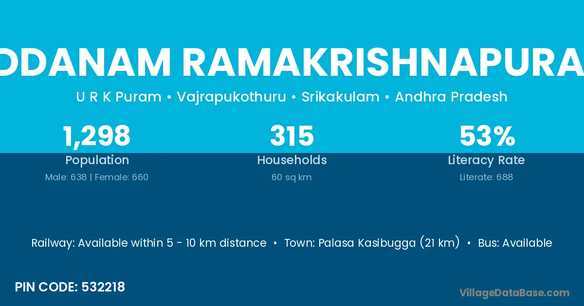 Uddanam Ramakrishnapuram village has a total population of 1,298 people, of which 638 are males and 660 are females.