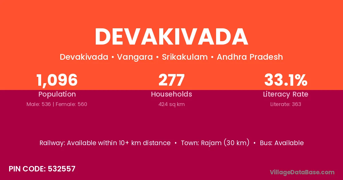 Devakivada village has a total population of 1,096 people, of which 536 are males and 560 are females.