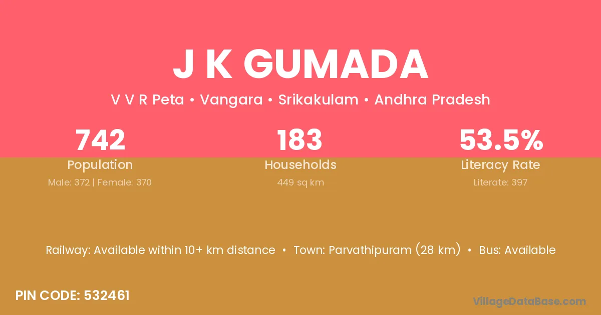 J K Gumada village has a total population of 742 people, of which 372 are males and 370 are females.