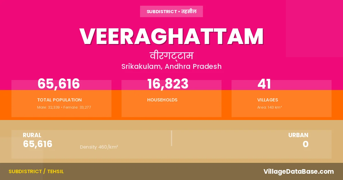 According to the 2011 census The total area of Veeraghattam Mandal is 143 km², with a population of 65616 people. The population density is 460 inhabitants per square kilometre, and there are approximately 16823 houses in the sub district.