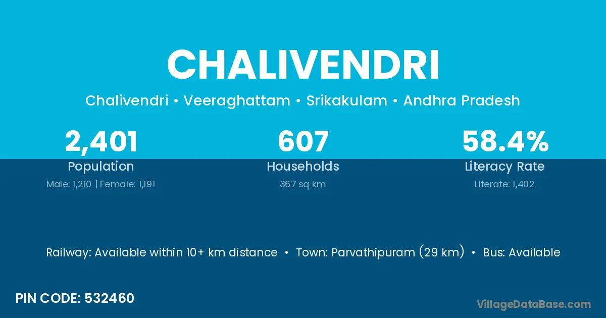 Chalivendri village has a total population of 2,401 people, of which 1,210 are males and 1,191 are females.