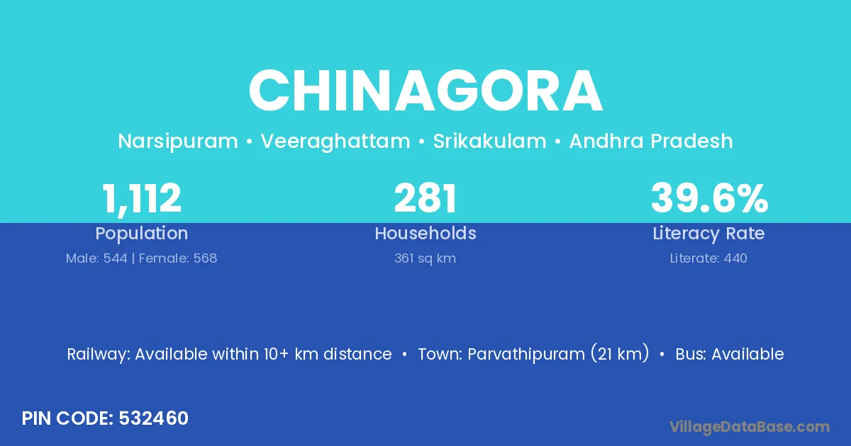 Parvathipuram (21 km) is the nearest town to Chinagora village for major economic activities and is located approximately 21 km away.