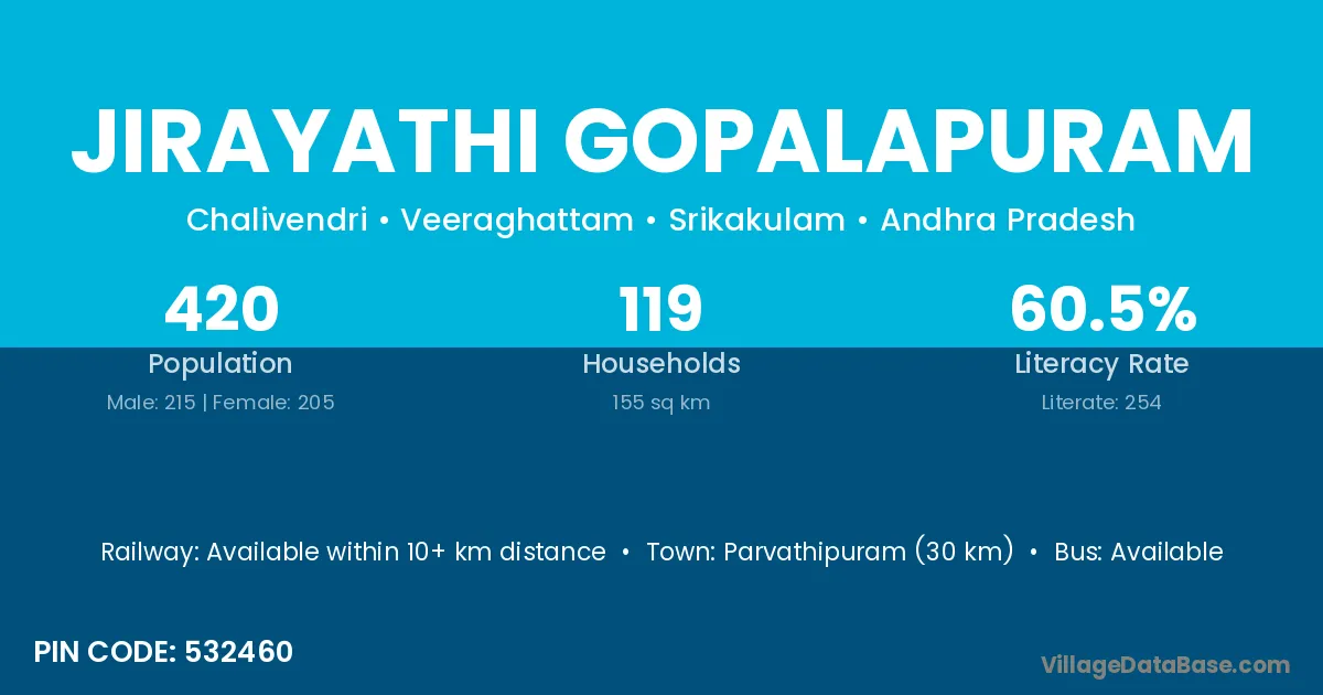 Parvathipuram (30 km) is the nearest town to Jirayathi Gopalapuram village for major economic activities and is located approximately 30 km away.