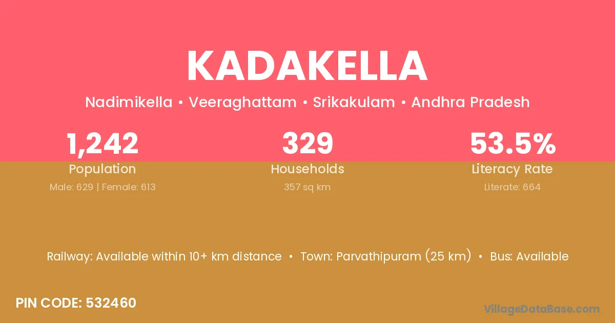 Parvathipuram (25 km) is the nearest town to Kadakella village for major economic activities and is located approximately 25 km away.