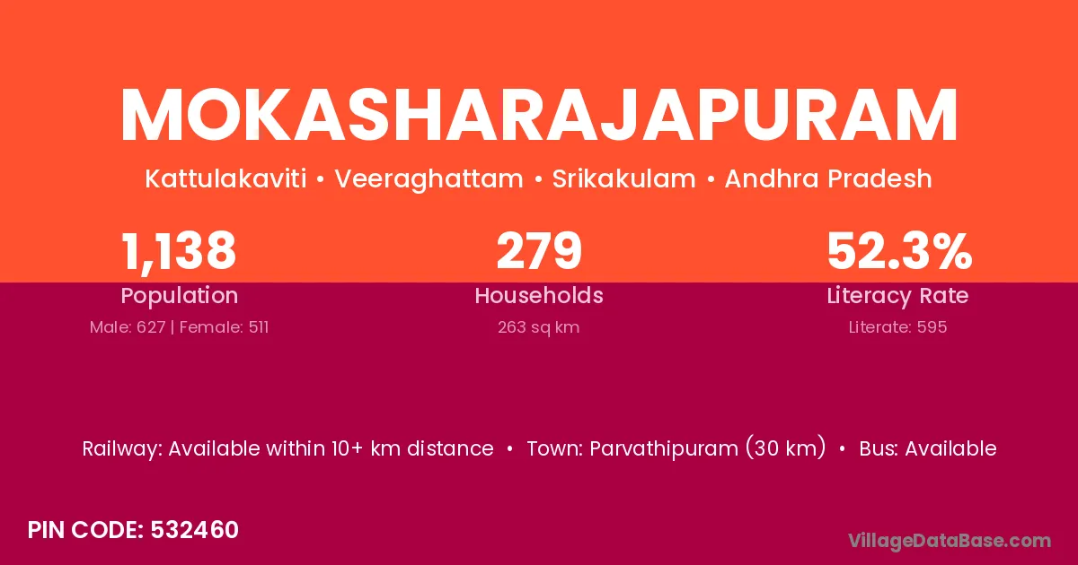 Parvathipuram (30 km) is the nearest town to Mokasharajapuram village for major economic activities and is located approximately 30 km away.