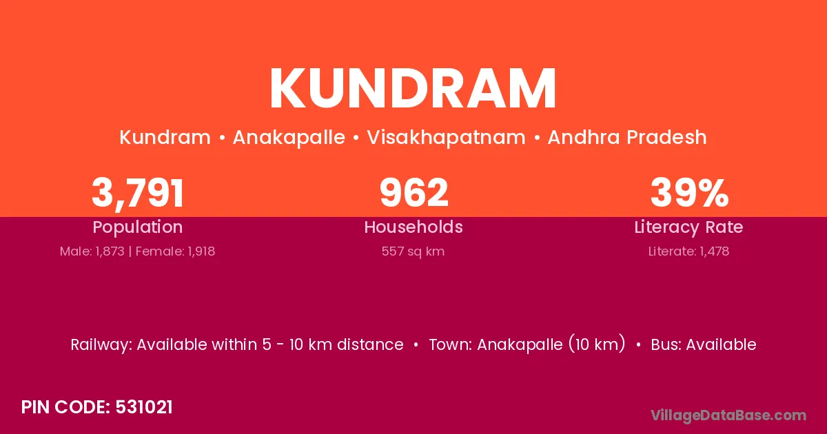 Anakapalle (10 km) is the nearest town to Kundram village for major economic activities and is located approximately 10 km away.