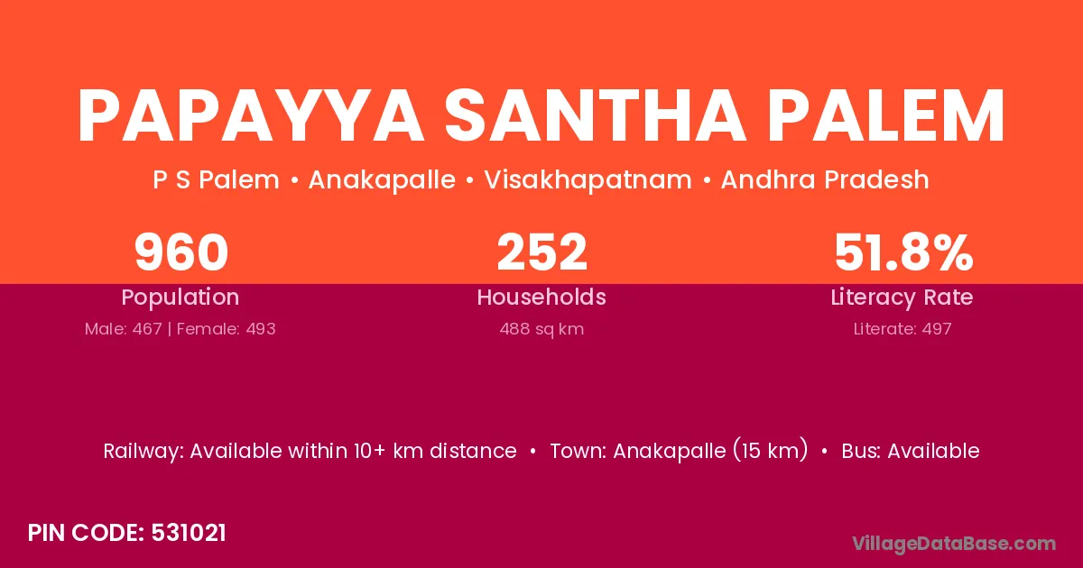 Papayya Santha Palem village has a total population of 960 people, of which 467 are males and 493 are females.