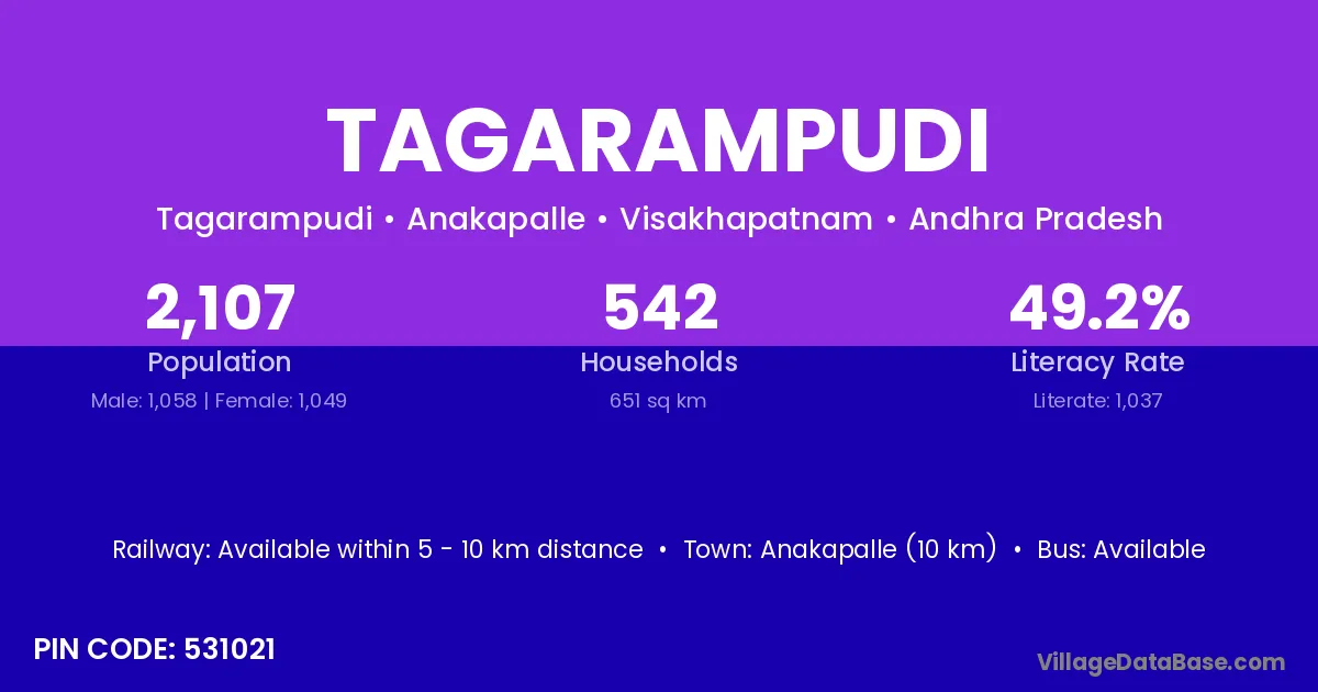 Anakapalle (10 km) is the nearest town to Tagarampudi village for major economic activities and is located approximately 10 km away.