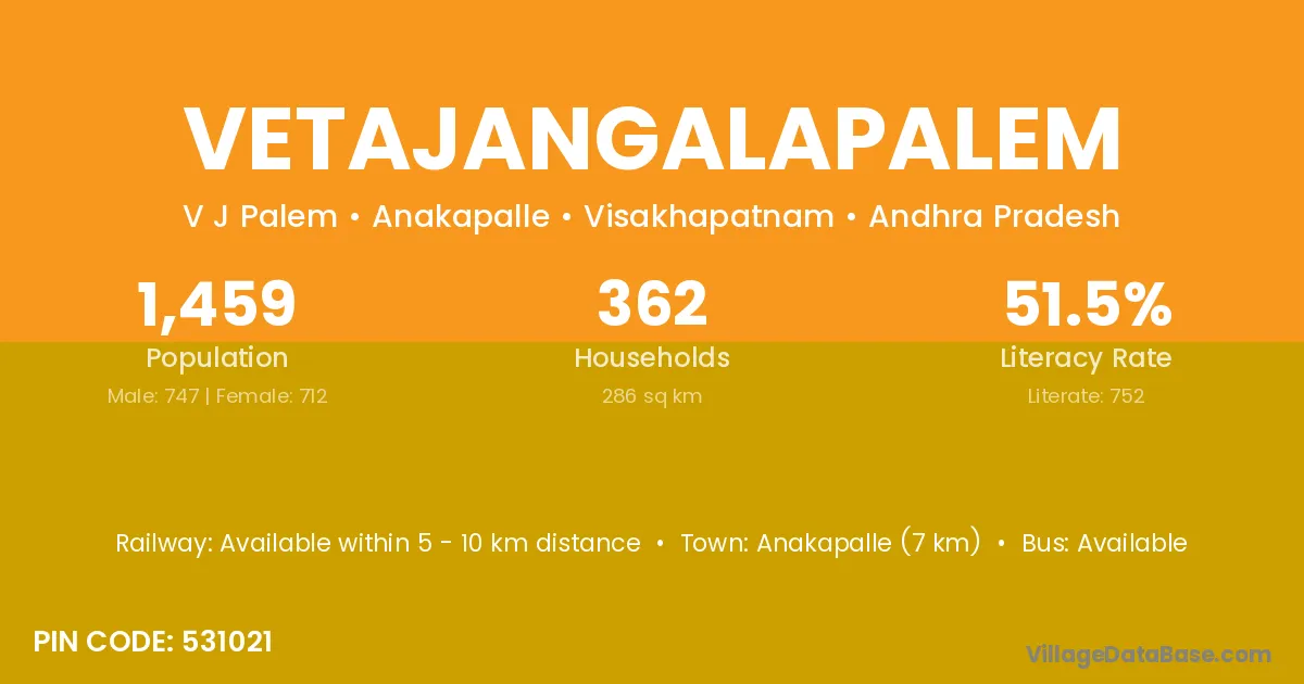 Vetajangalapalem village has a total population of 1,459 people, of which 747 are males and 712 are females.