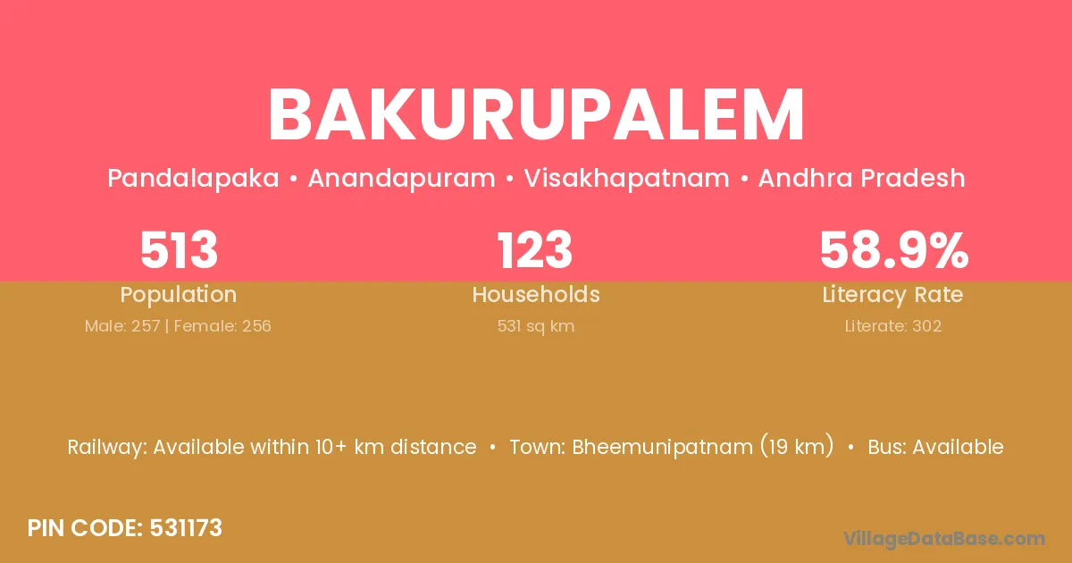 Bakurupalem village has a total population of 513 people, of which 257 are males and 256 are females.