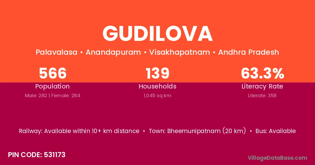 Bheemunipatnam (20 km) is the nearest town to Gudilova village for major economic activities and is located approximately 20 km away.
