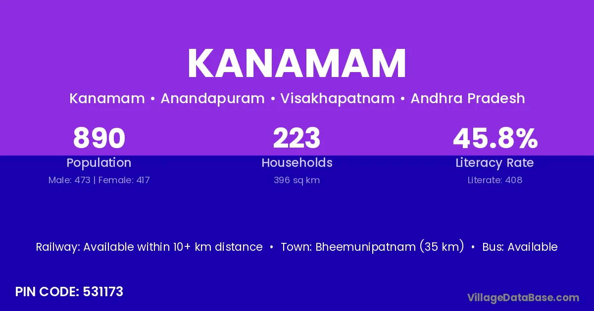 Bheemunipatnam (35 km) is the nearest town to Kanamam village for major economic activities and is located approximately 35 km away.