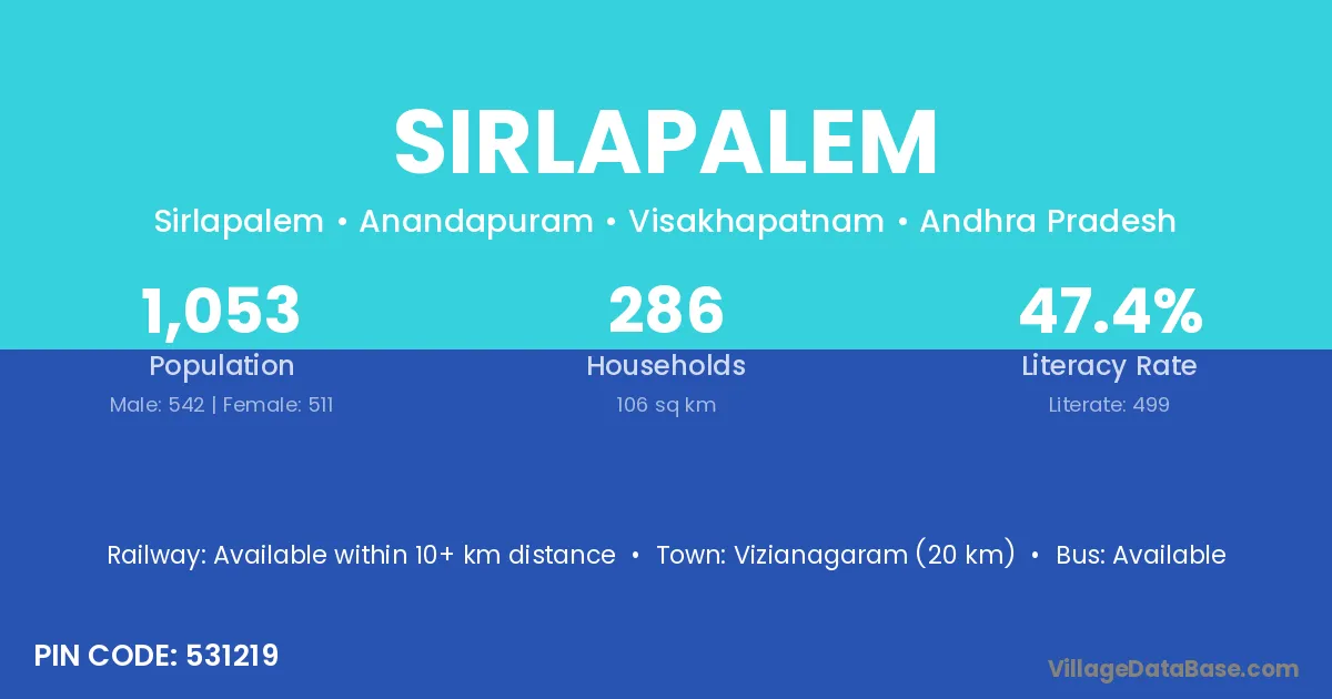 Sirlapalem village has a total population of 1,053 people, of which 542 are males and 511 are females.