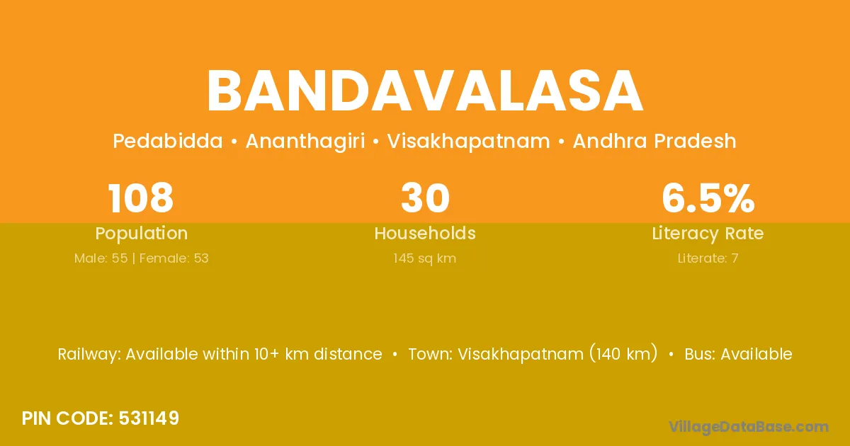 Bandavalasa village has a total population of 108 people, of which 55 are males and 53 are females.