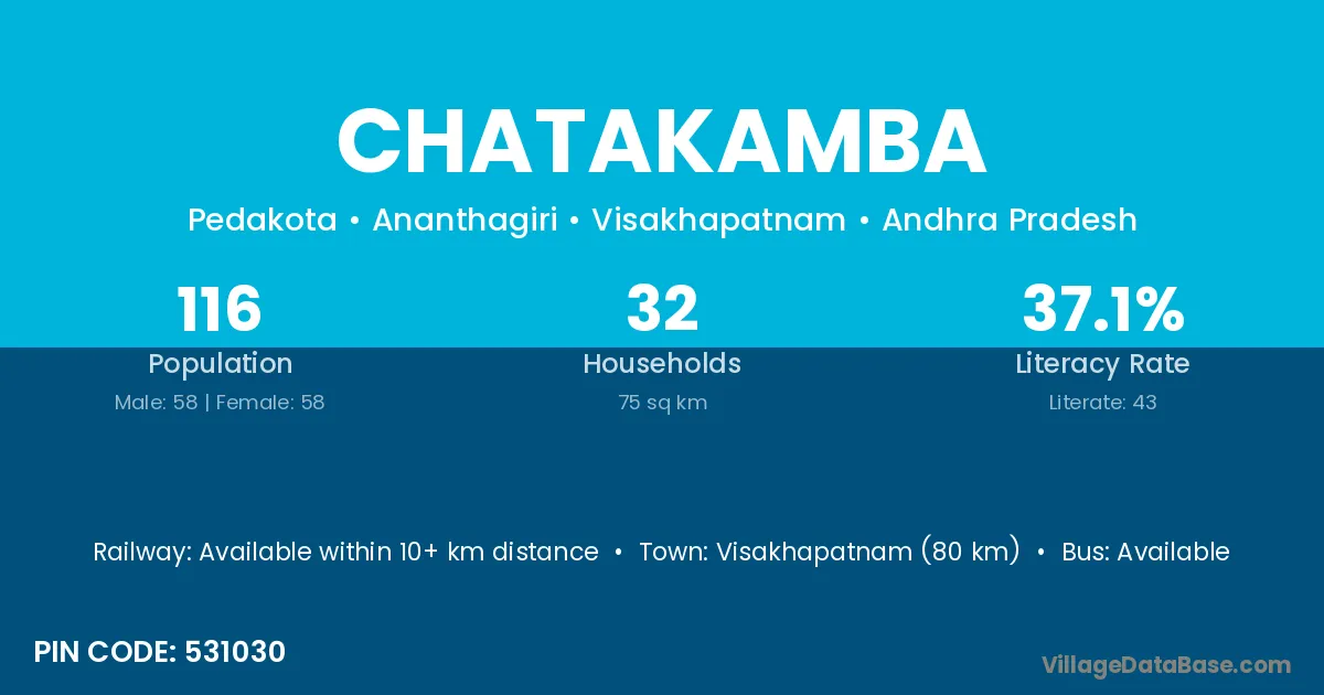 Visakhapatnam (80 km) is the nearest town to Chatakamba village for major economic activities and is located approximately 80 km away.