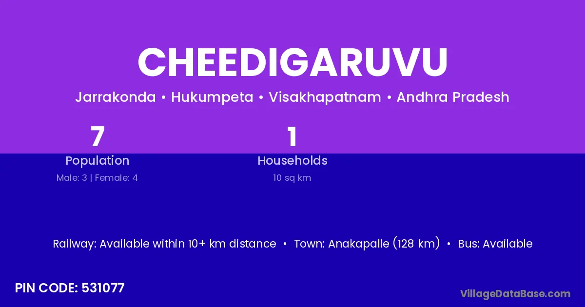 Visakhapatnam (100 km) is the nearest town to Cheedigaruvu village for major economic activities and is located approximately 100 km away.