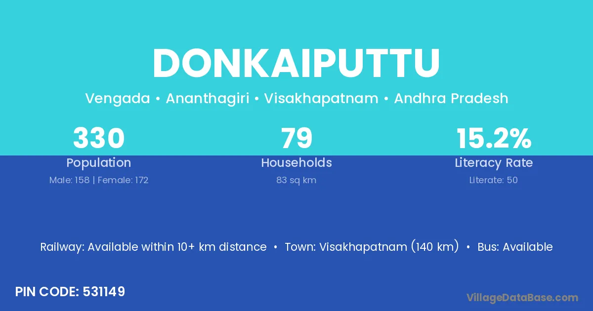 Visakhapatnam (140 km) is the nearest town to Donkaiputtu village for major economic activities and is located approximately 140 km away.