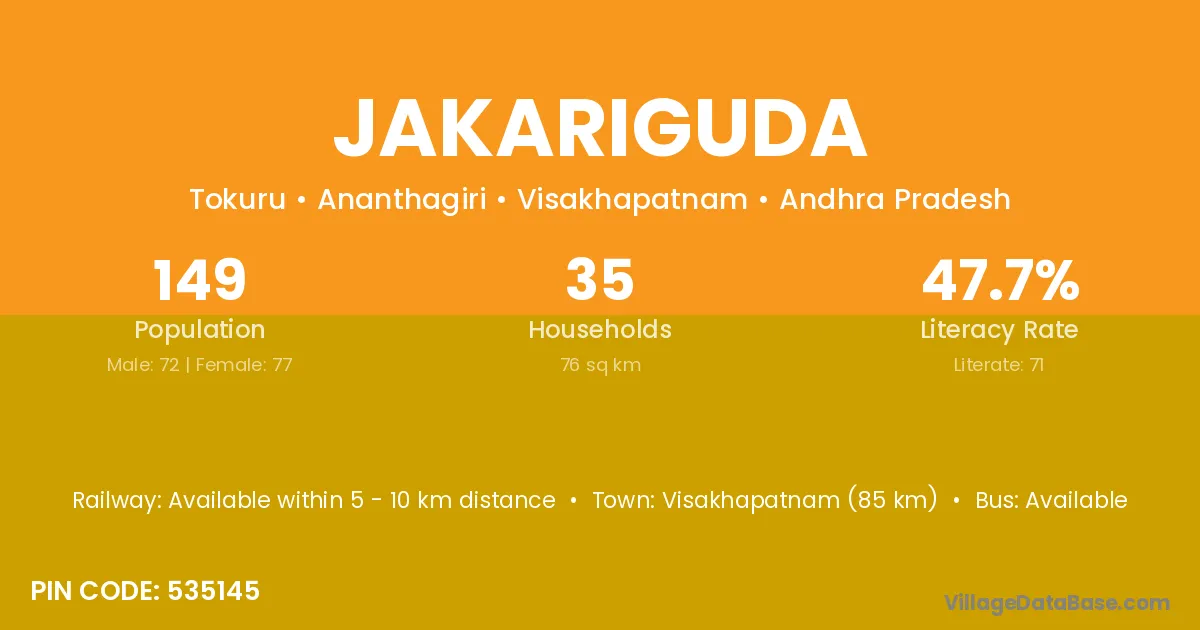Visakhapatnam (85 km) is the nearest town to Jakariguda village for major economic activities and is located approximately 85 km away.